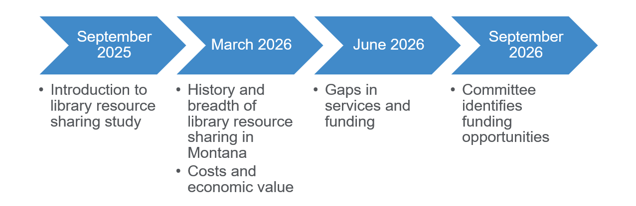 - March 2026: Overview of the breadth and interrelationships of current resource-sharing services necessary to meet Montanans information needs and to achieve educational goals. Overview of the costs and economic value achieved when investing in resource-sharing services statewide.